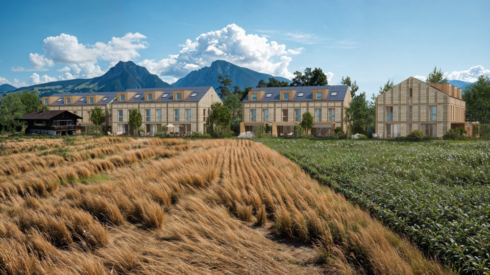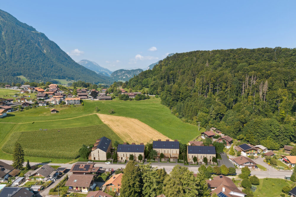 In Hondrich (Spiez) entstehen zwölf hochwertige Reiheneinfamilienhäuser, die modernes Wohnen mit nachhaltigen Technologien vereinen.