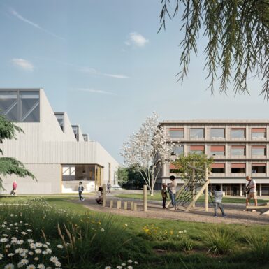Aménagements extérieurs et environnement : Les différentes parcelles sont reliées par un chemin arboré et un jardin didactique. Des zones de jeux et de détente ainsi qu’une esplanade avec terrain de sport complètent l’aménagement. Ouverts aux élèves comme aux habitants, ces espaces extérieurs forment un cœur vert et protégé, volontairement préservé du contexte urbain et industriel environnant.